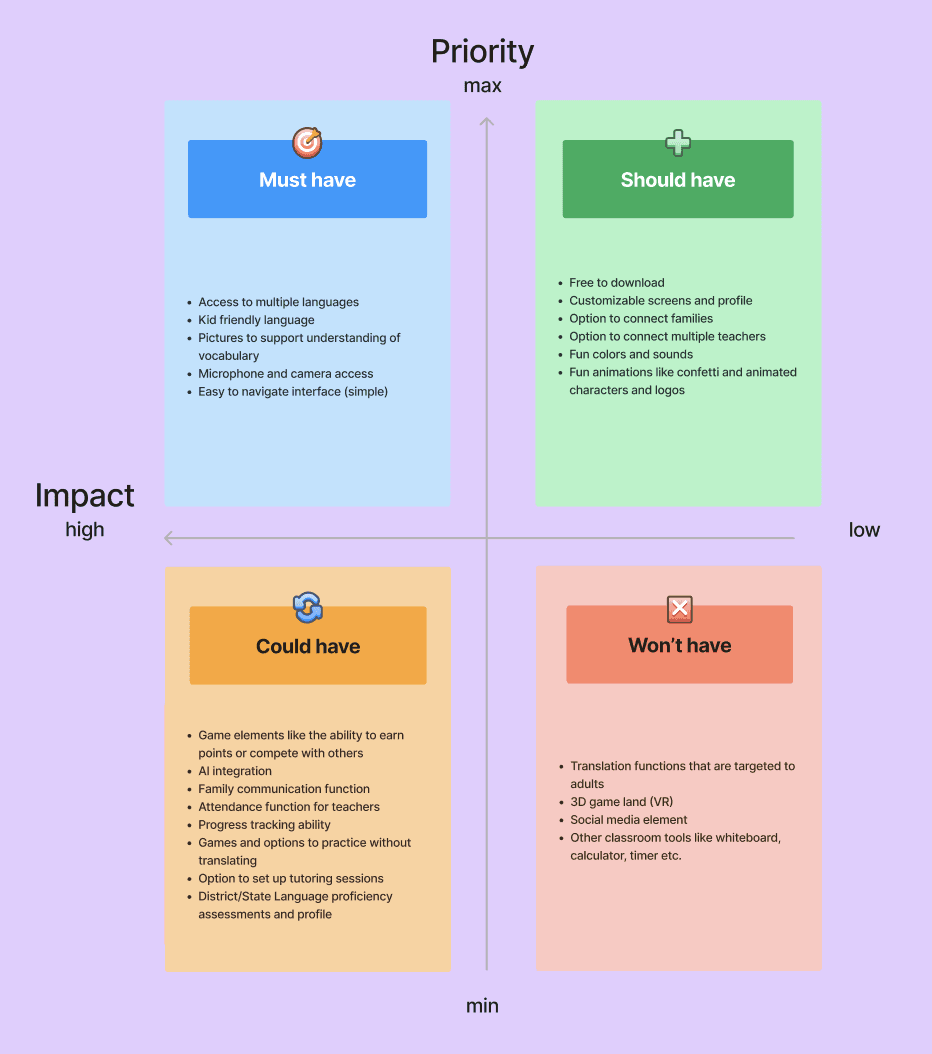 Following established methodology, I employed organizational tools such as the MoSCoW Matrix to generate ideas and begin prioritizing features essential for inclusion in the design.