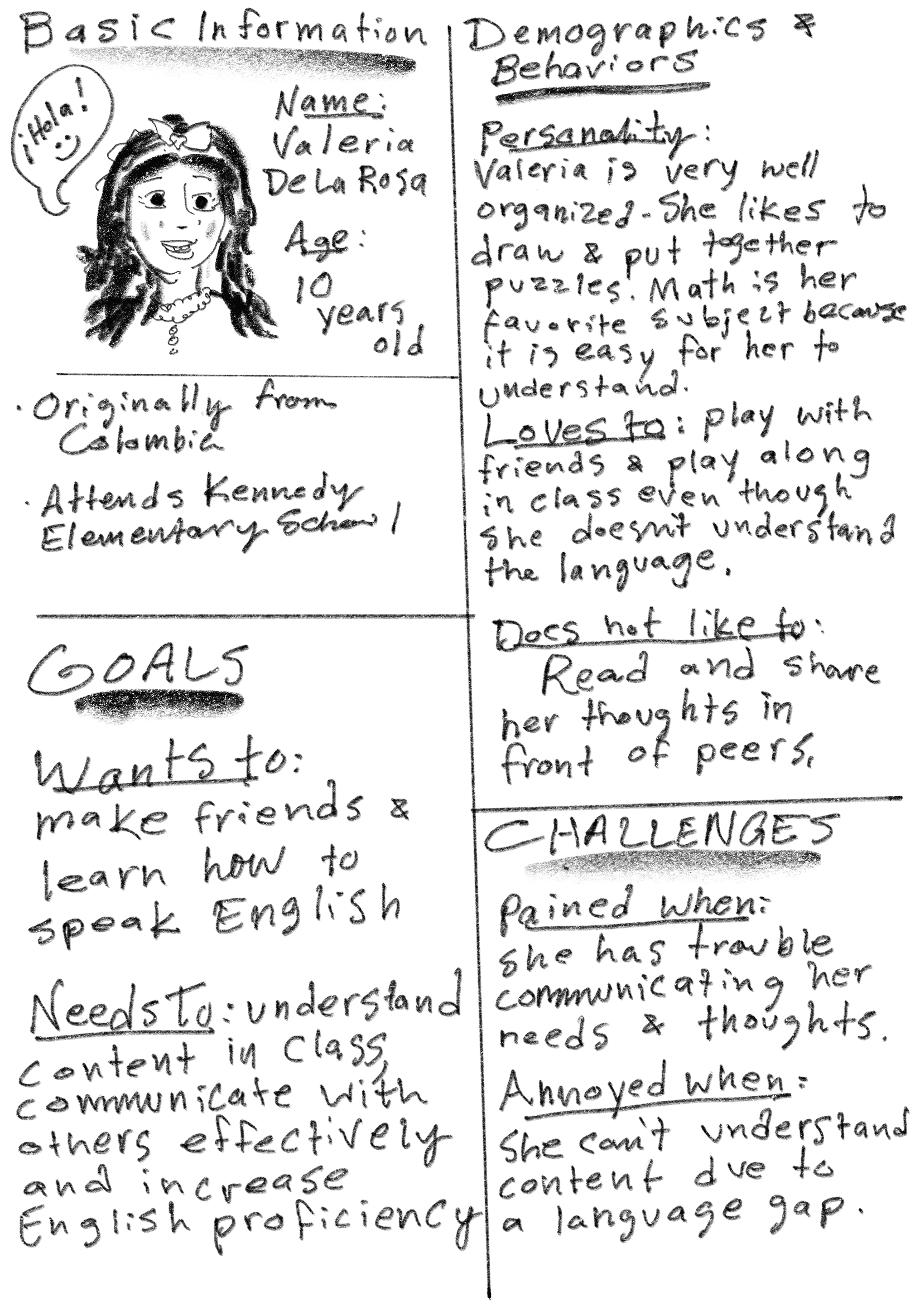 Valeria, an elementary school student who recently immigrated to the city, needs to feel respected and valued at school because her thoughts, ideas and feelings are important and add value to her classes and community.